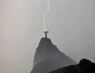 En febrero 11 del presente año Dios parece que quiso mandarle un mensaje al Cristo Redentor de Río de Janeiro porque como pueden observar una descarga eléctrica le pega a la 700 toneladas y no hubo daños a la estatua. Esta estatua está considerada como el Cristo más grande del mundo en la tierra. Por allá estuvo nuestro colega Ramón Anibal hace unos años y actualmente mi hermana está de gira por allá ahora mismo.